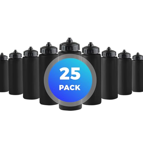 Bulk pack of 25 water bottles, BPA-free refillable squeeze bottles, black bottles with black lids, 32oz sport bottles for teams, events, and promotions.