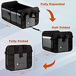 INNOVATIVE DESIGN: Our trunk organizer expands to just the right size of 22 ½ inches (l) x 14 inches (w) x 12 inches (h). Our car organizer includes a detachable sturdy lid, 4 interior compartments with Velcro dividers, 10 exterior pockets, and 2 tie-down straps. The collapsible bottom folds up flat to 1 inch thin and locks with attached clasps for easy storage when not in use.