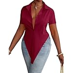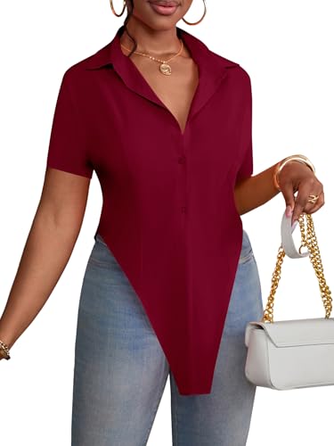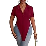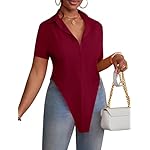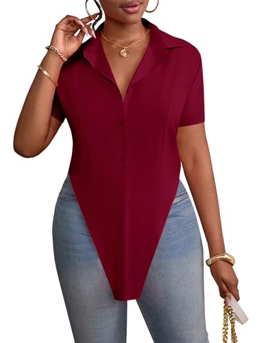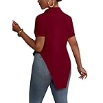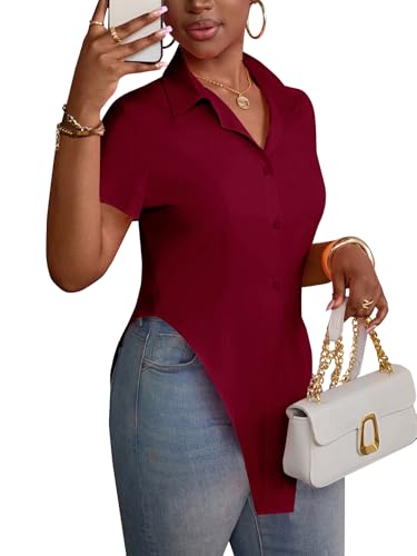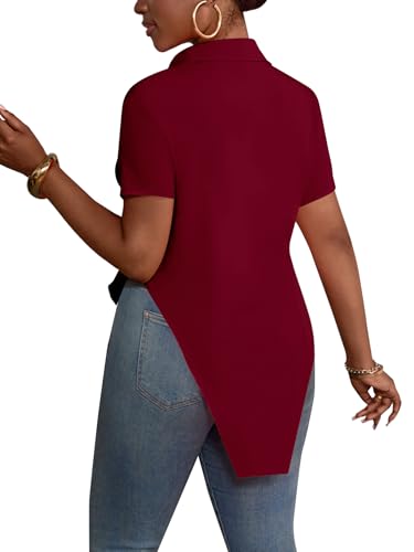 LYANER Women’s Collar V Neck Button Front Short Sleeve Slit Hem Long Shirt Blouse Top