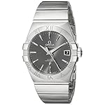 Stainless steel case with a stainless steel bracelet. Stainless steel bezel. Dark grey dial with silver-tone hands and index hour markers. Minute markers around the outer rim. Dial type: analog. Luminescent hands and markers. Date display at the 3 o’clock position. Automatic movement with a 60 hour power reserve. Scratch resistant sapphire crystal. Skeleton case back. Case diameter: 38 mm. Round case shape. Deployment clasp. Water resistant at 100 meters / 330 feet. Functions: date, hour, minute, second. Dress watch style. Watch label: Swiss made. Omega constellation automatic black dial stainless steel unisex watch 12310382106001.