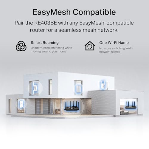 Extend your WiFi performance like never before with the TP-Link BE6300 Dual-Band Wi-Fi 7 Range Extender RE403BE. When paired with a WiFi 7 router, achieve the benefits of WiFi 7’s Multi-Link Operation (MLO), Multi-RUs, and 4K-QAM. 6-stream, dual-band WiFi with 6.3 Gbps of total bandwidth and maximized coverage up to 2800 sq. ft.. Say goodbye to WiFi dead zones and enjoy seamless streaming on Netflix, Prime Video, Disney+, and more – while browsing at ultra-fast speeds on your WiFi 7 devices, like the iPhone 16 Pro, the Google Pixel 9, or PS5 Pro. RE403BE supports EasyMesh, the easiest way to create a whole-home mesh Wi-Fi network with your existing router, eliminating dead zones for seamless coverage. The 2.5 Gbps Ethernet port provides lightning-fast stability for direct connections to smart TVs, computers, and gaming consoles. Great for gamers, streamers, parents, professionals, or anyone managing a busy household.